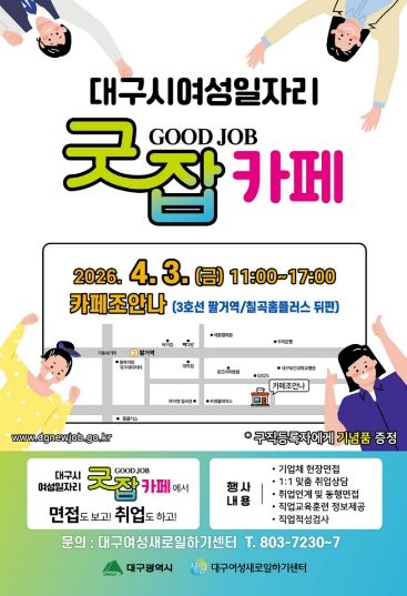 • 대구광역시는 취업을 희망하는 경력단절 및 미취업 여성을 위해 4월 3일 오전 11시부터 북구 소재 ‘카페 조안나(칠곡점)’에서 올해 첫 ‘찾아가는 여성일자리 굿잡(Good Job)카페’를 개최한다.