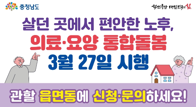 • 충남도는 오는 27일부터 시행되는 ‘의료·요양 등 지역 돌봄의 통합지원에 관한 법률’에 대한 도민들의 이해를 돕고, 조기 안착을 지원하기 위해 ‘집중 홍보 주간’을 운영한다고 16일 밝혔다.